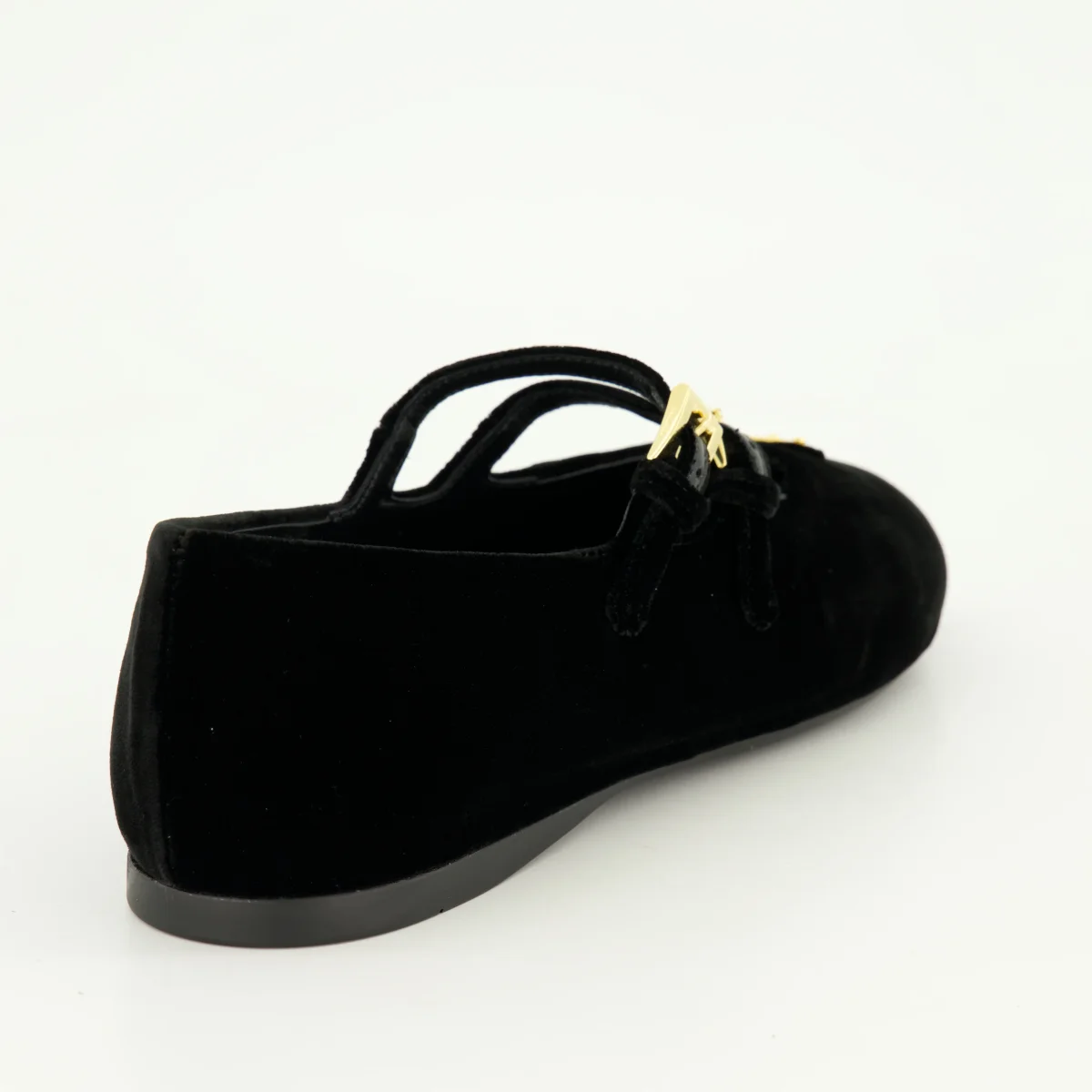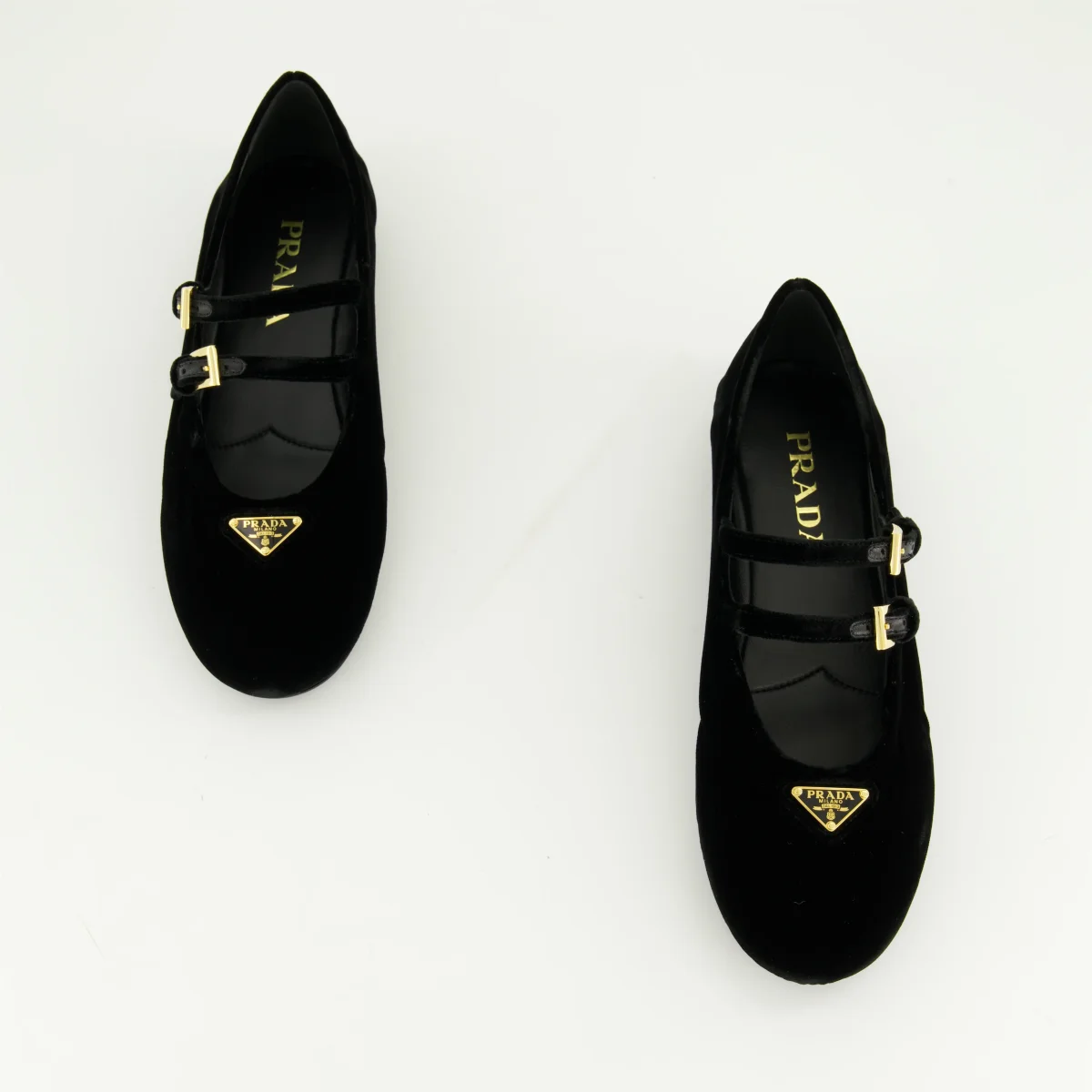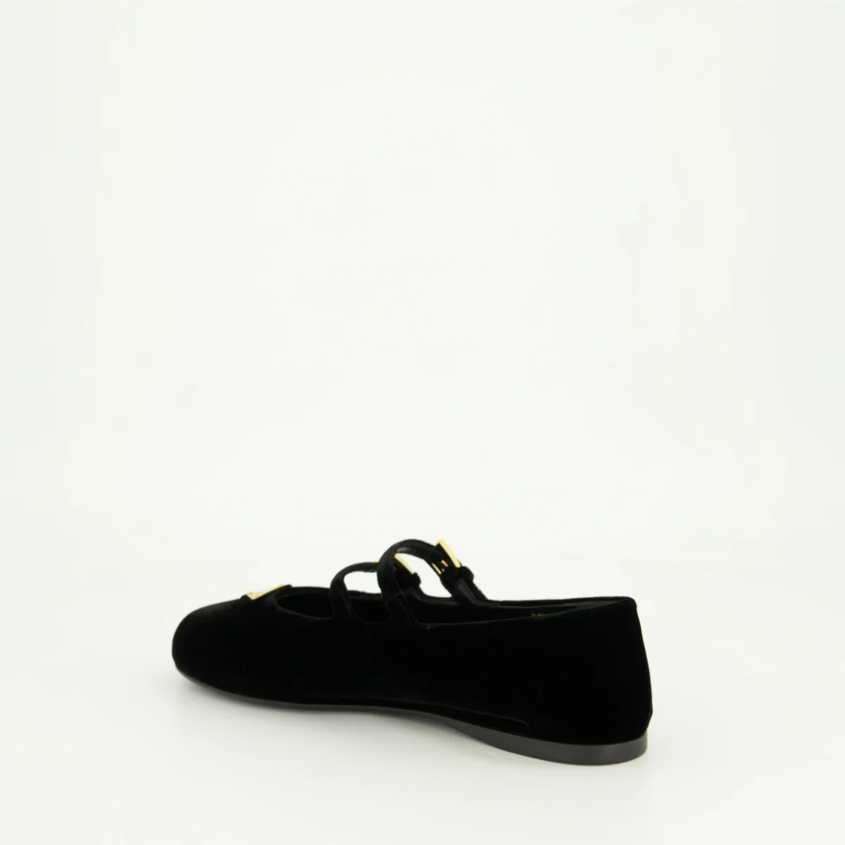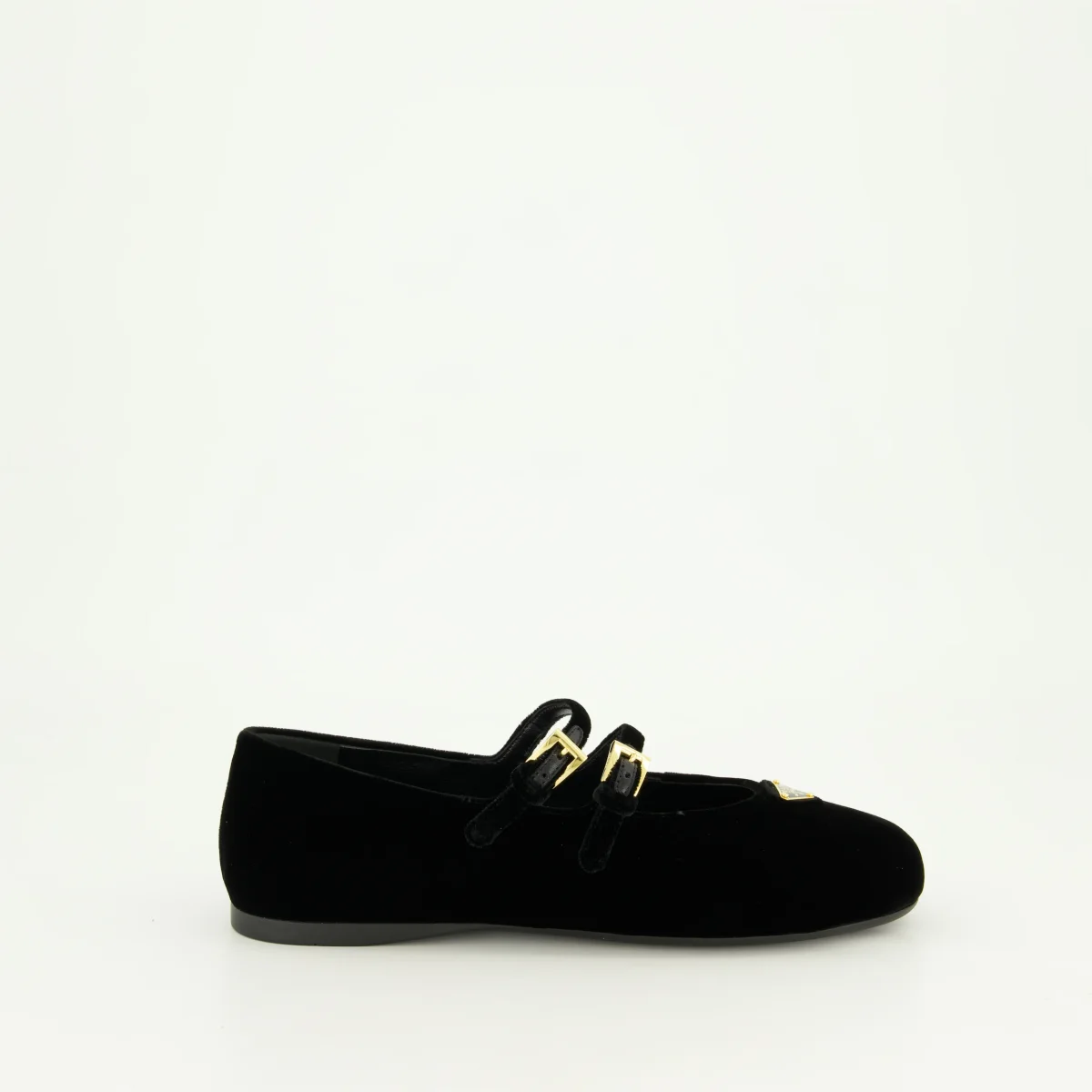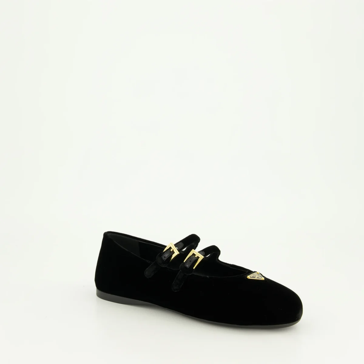 Ballerines en velours noir de Prada pour femme, collection Printemps-Été 2025. Elles présentent des brides ajustables, un bout en amande et un logo triangle en métal émaillé.