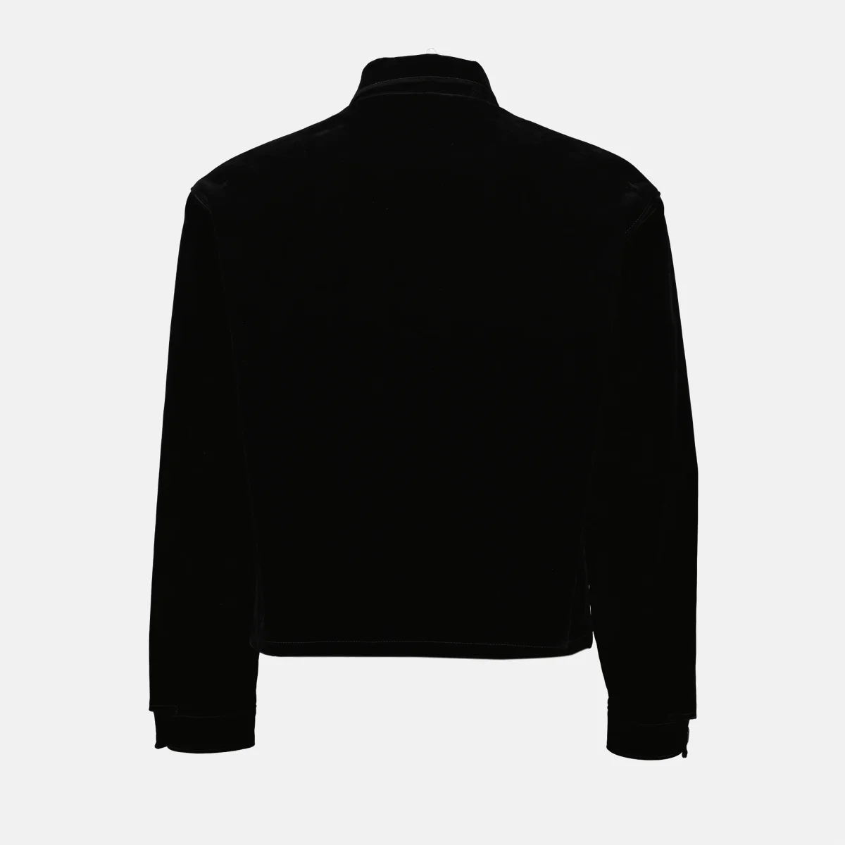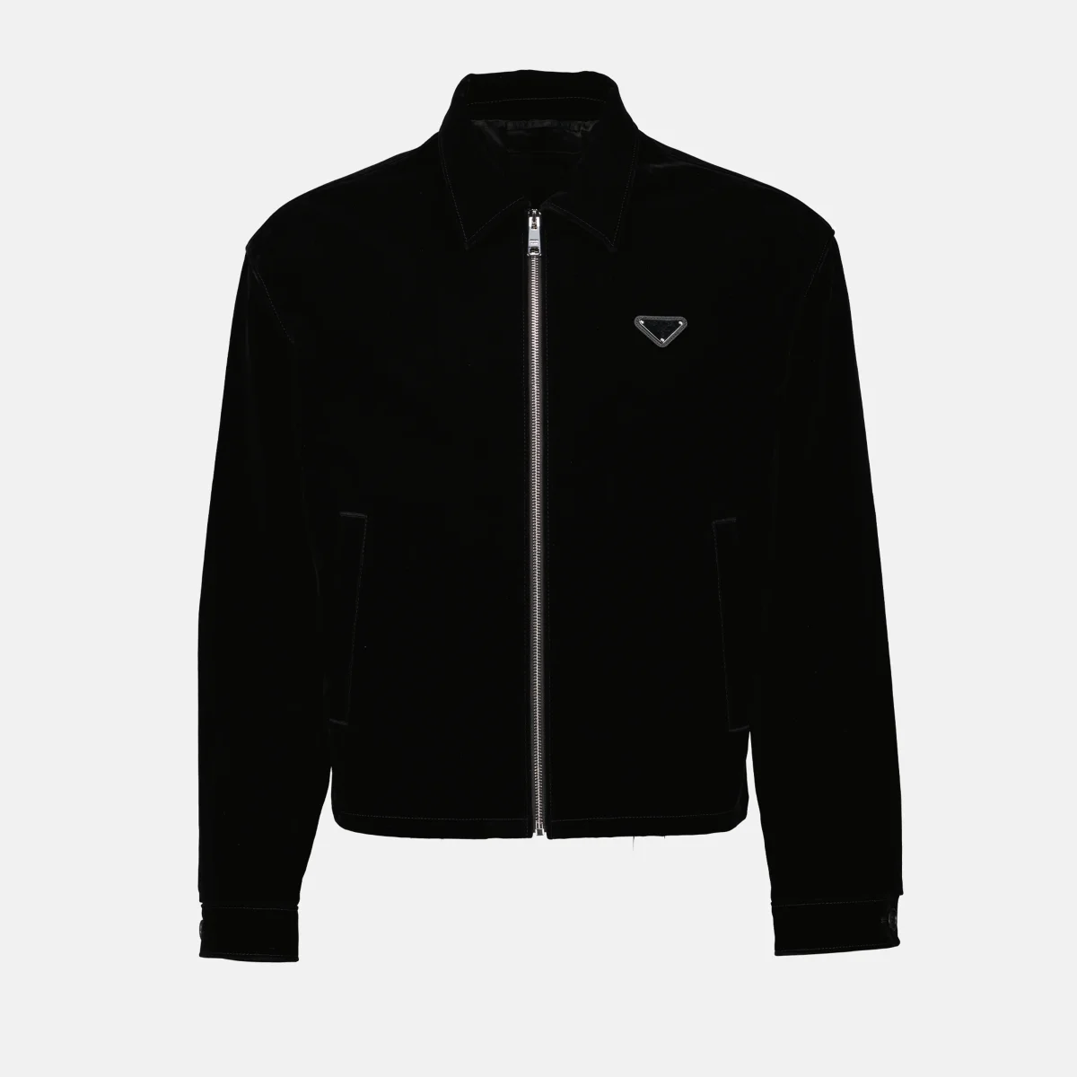 Blouson en velours noir de Prada pour homme, il présente une coupe droite avec col classique et manches longues. Cette pièce fait partie de la collection Automne-Hiver 2024.
