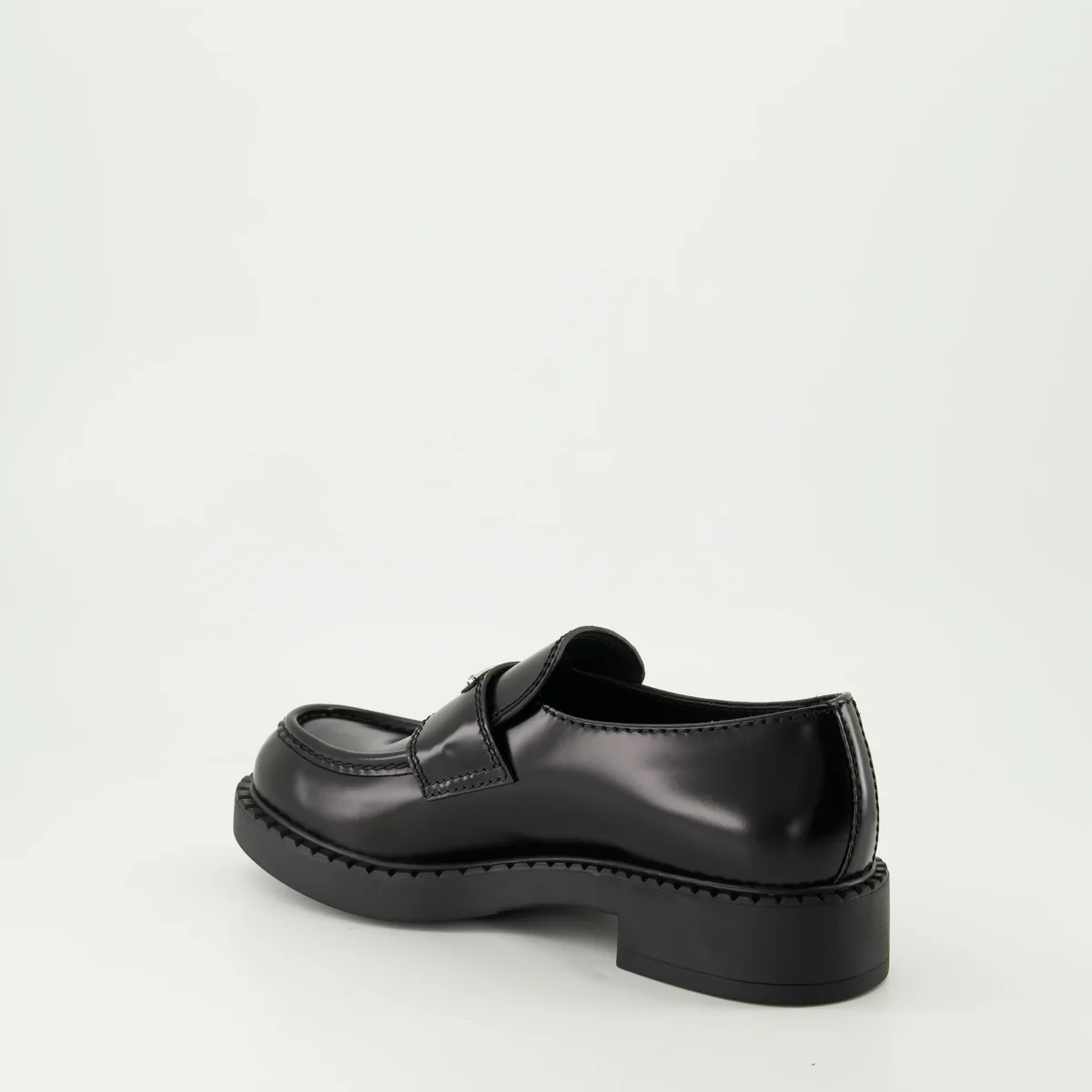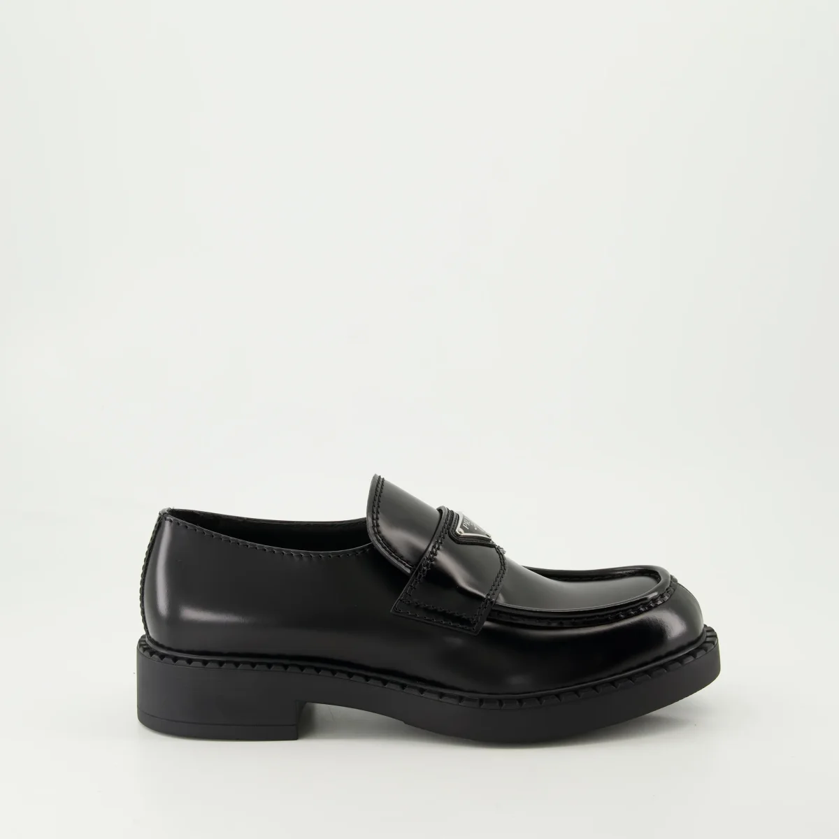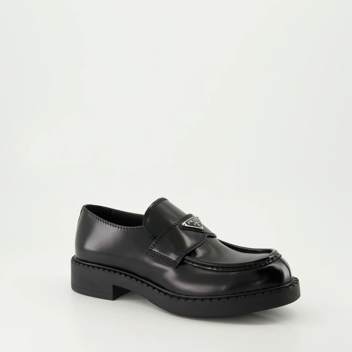 Mocassins Chocolate en cuir noir brossé de Prada, pour homme, sont un modèle à enfiler avec un design élégant. Ils font partie de la collection Printemps-Été 2025.