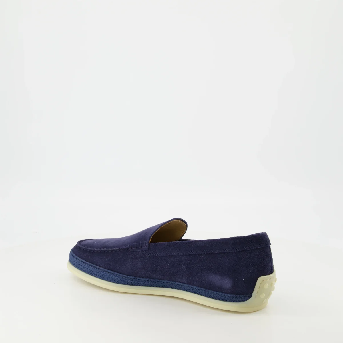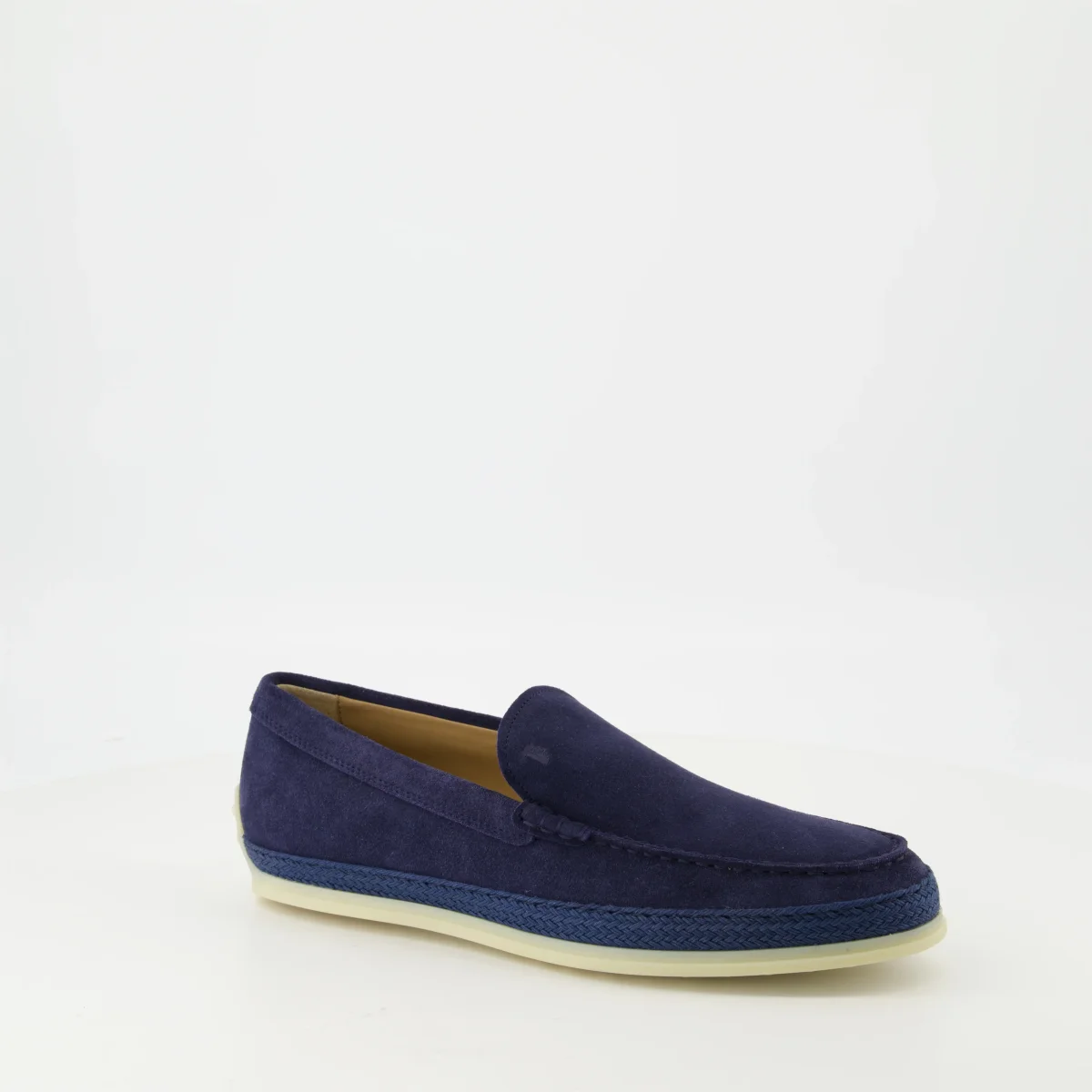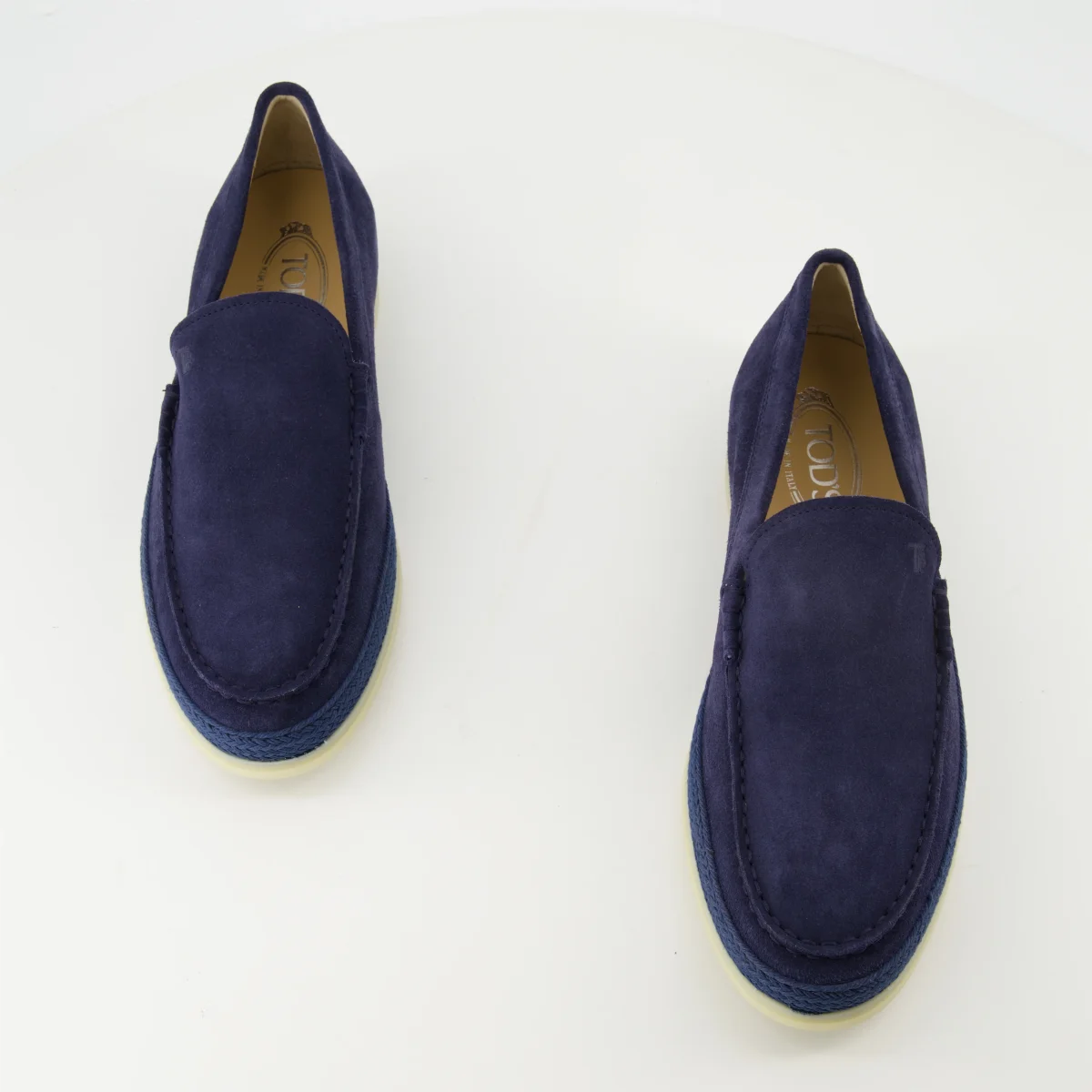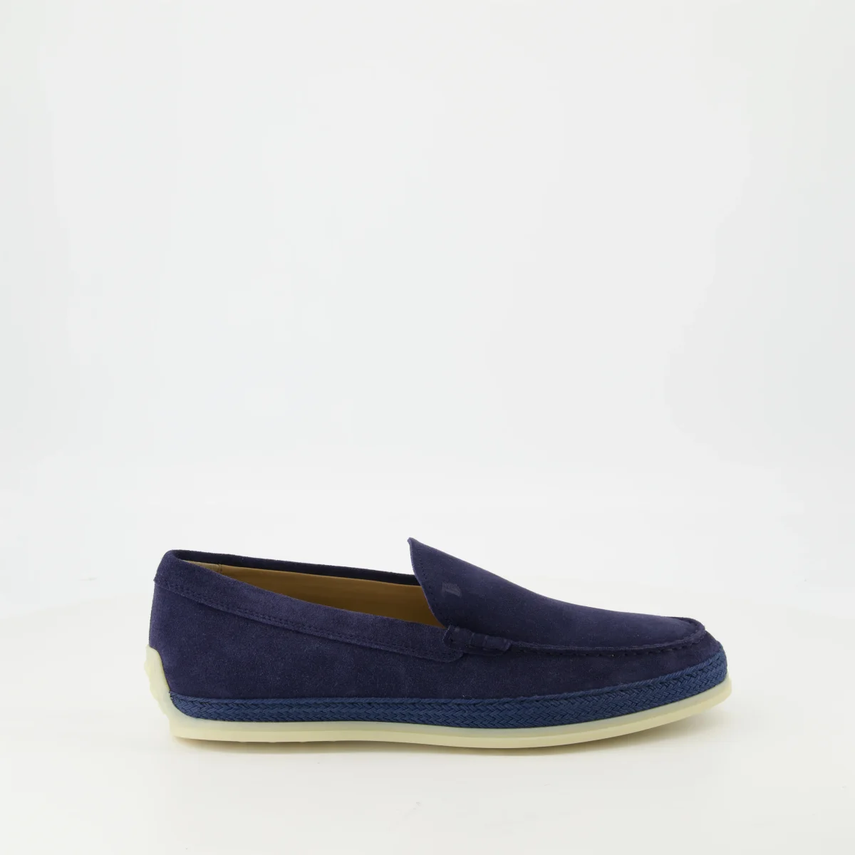 Mocassins en cuir velours bleu de Tod’s pour homme, collection Printemps-Été 2025. Modèle à enfiler avec semelle crantée en gomme et détails en tressage artisanal.