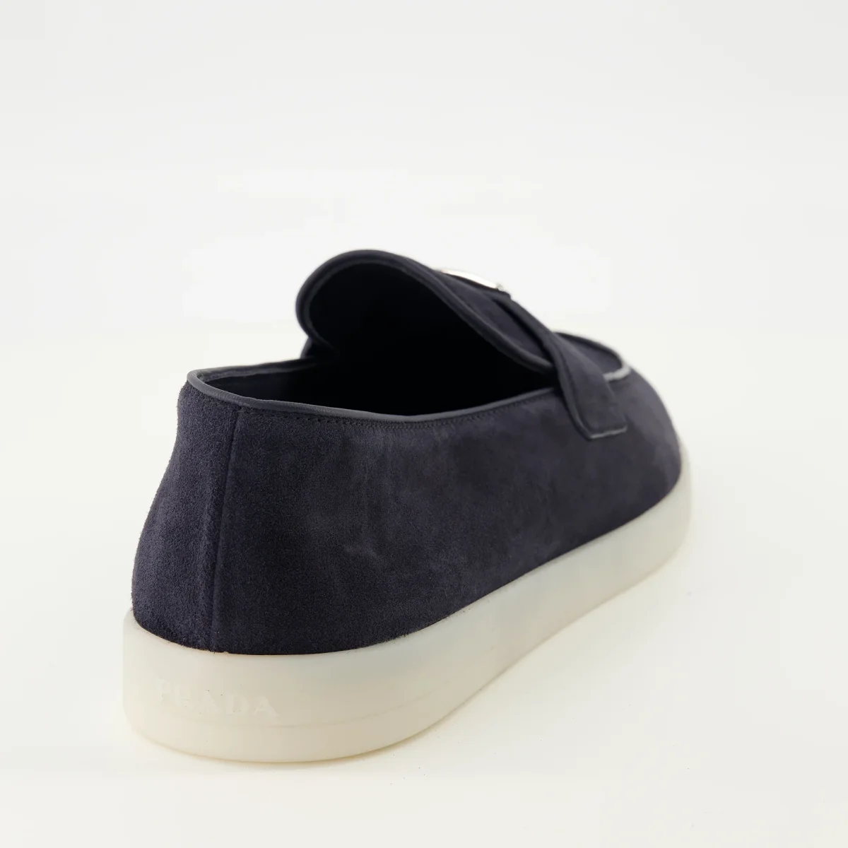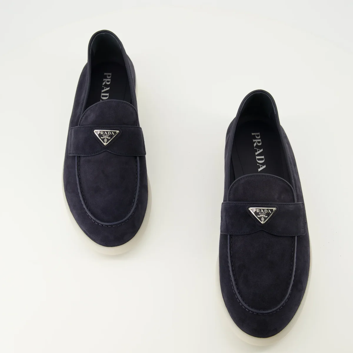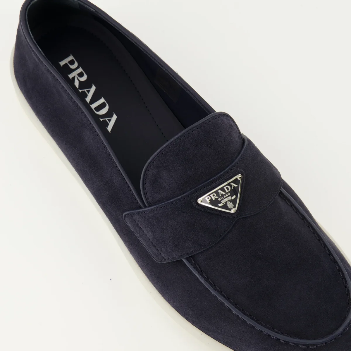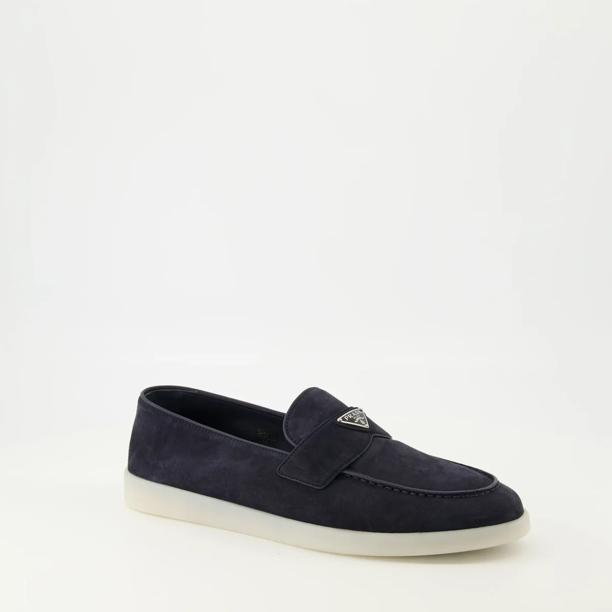 Mocassins en veau velours bleu marine de Prada, pour homme. Cette paire fait partie de la collection Printemps-Été 2026 et présente un design à enfiler avec un logo triangle.